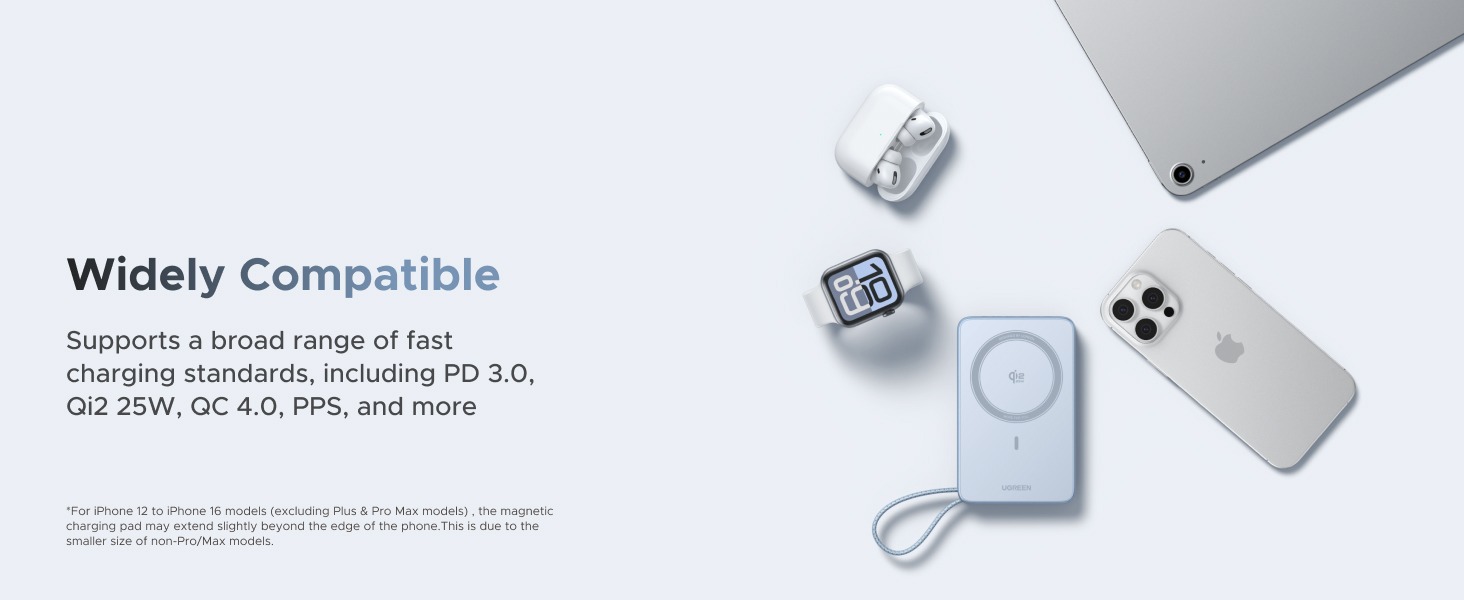This power bank is optimized for the latest devices that support 25W wireless charging. The compatibility list is continuously updated as new models are released.