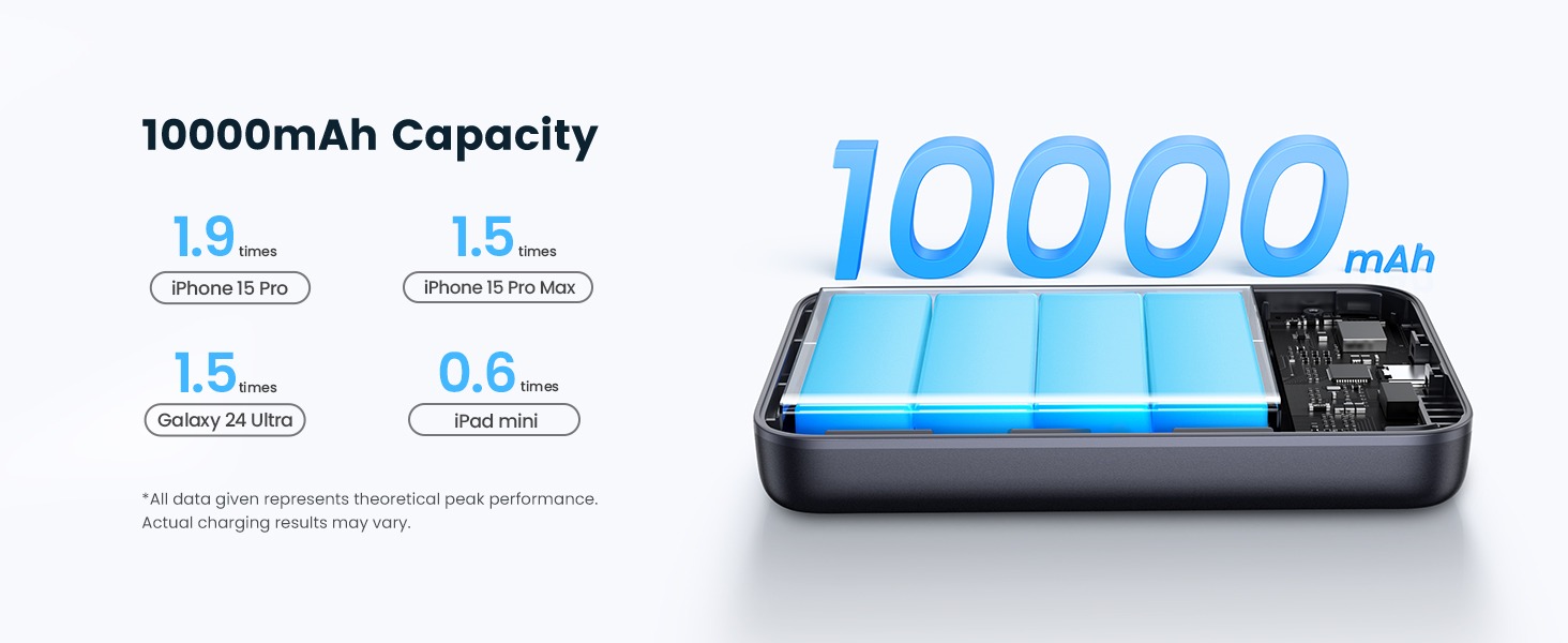 - Battery Capacity: 10,000mAh (36Wh), providing substantial power for multiple device charges.