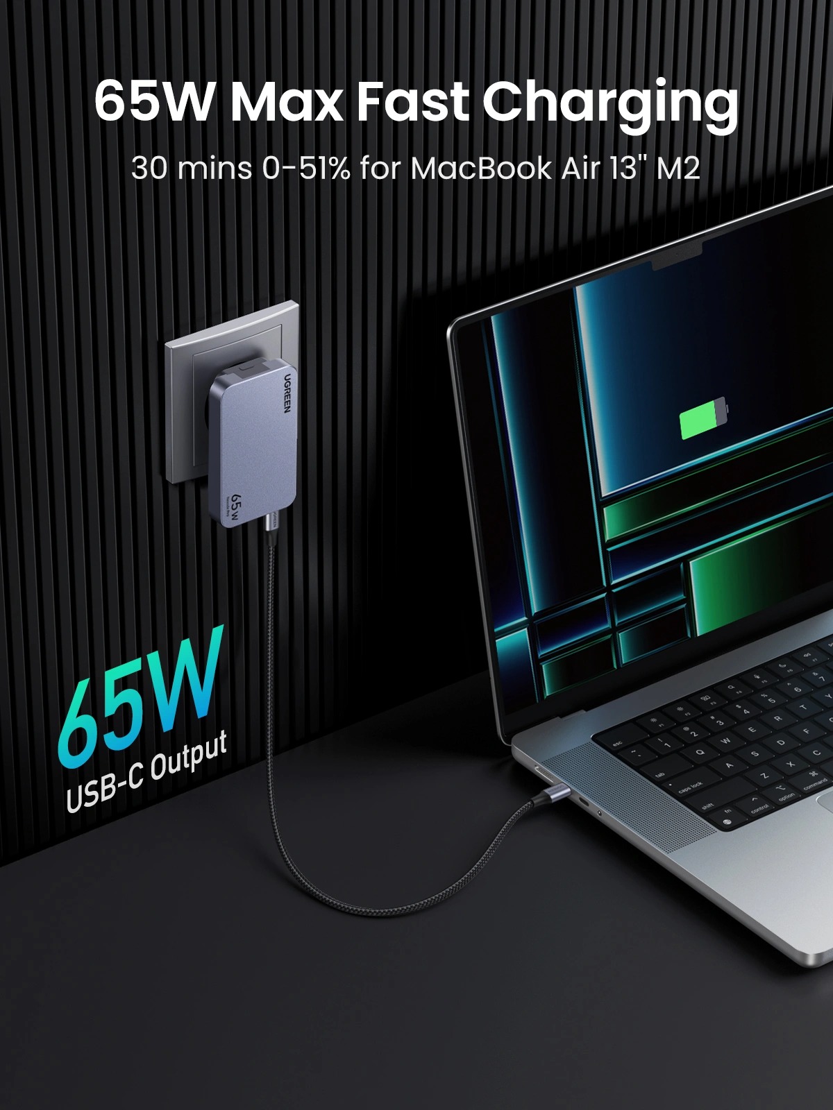 • 65W PD fast charging charges a MacBook Air M2 to 50% in just 30 minutes.